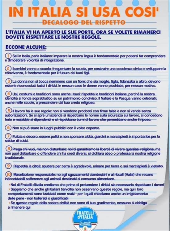 Io plaudo a questa iniziativa, perché dimostra la comunanza di abitudini tra italiani e immigrati. Siamo tutti fratelli, insomma. Anche se non è esattamente ciò che il movimento di destra guidato da Giorgia Meloni intende sostenere. Ecco qui le regole, seguite da un mio commento in corsivo1) Sei in Italia, parla italiano: imparare la nostra lingua è fondamentale per potersi far comprendere e dimostrare volontà di integrazione. [Ma se ci sono persino giornalisti (italiani, s’intende) che dovrebbero tornare a scuola a imparare che si scrive “un altro” e non “un’altro” e “un po’ ” e non “un pò”!]